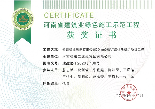 郑州豫能热电有限公司2×660MW燃煤供热机组项目工程荣获河南省建筑业绿色施工示范工程