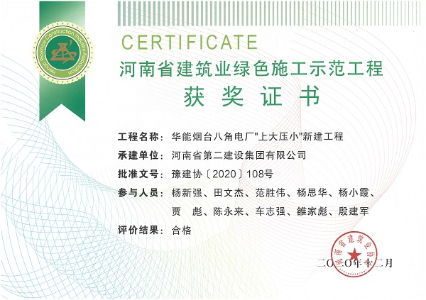 华能烟台八角电厂“上大压小”新建工程荣获河南省建筑业绿色施工示范工程