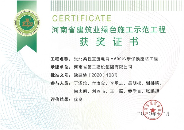张北柔性直流电网±500KV康保换流站工程荣获河南省建筑业绿色施工示范工程