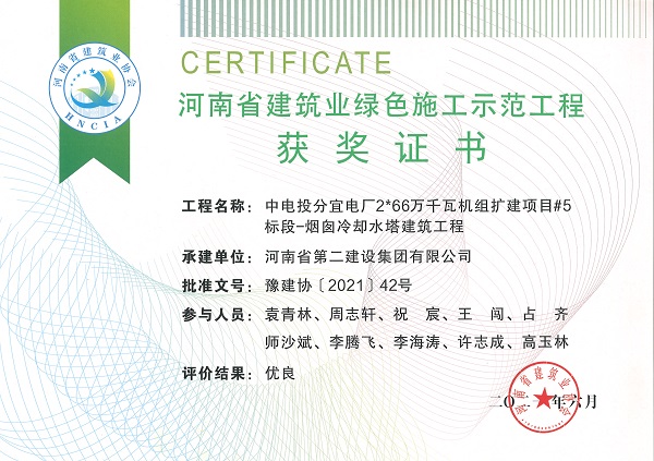 中电投分宜电厂2×66万千瓦机组扩建项目#5标段-烟囱冷却水塔建筑工程荣获河南省建筑业绿色施工示范工程