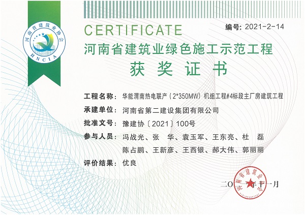 华能渭南热电联产(2×350MW)机组工程#4标段主厂房建筑工程荣获河南省建筑业绿色施工示范工程