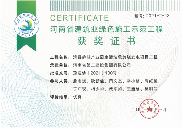 滑县静脉产业园生活垃圾焚烧发电项目工程荣获河南省建筑业绿色施工示范工程