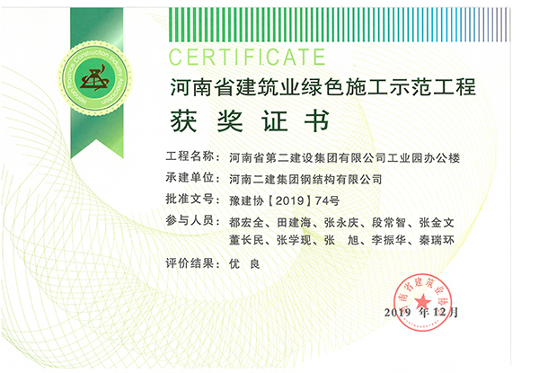河南省第二建设集团有限公司工业园办公楼荣获河南省建筑业绿色施工示范工程