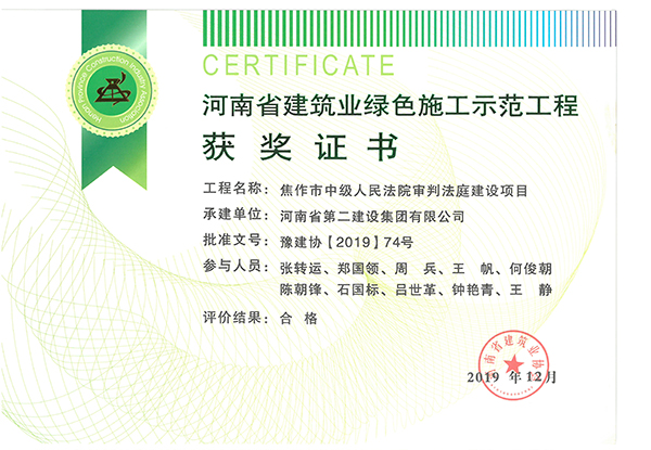 焦作市中级人民法院审判法庭建设项目荣获河南省建筑业绿色施工示范工程