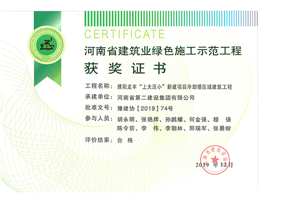 濮阳龙丰“上大压小”新建项目冷却塔区域建筑工程荣获河南省建筑业绿色施工示范工程