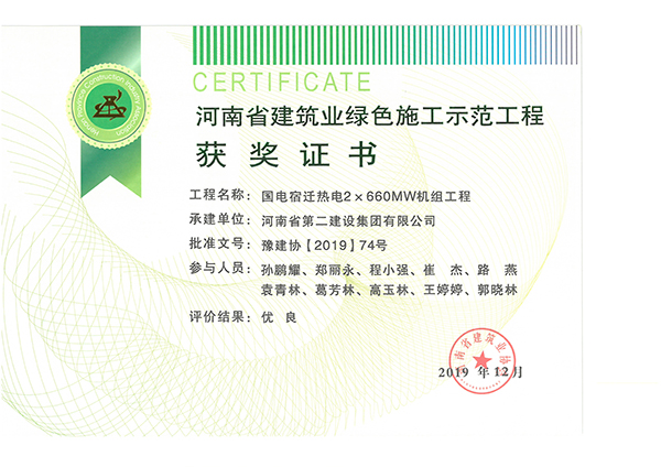 国电宿迁热电2×660MW机组工程荣获河南省建筑业绿色施工示范工程
