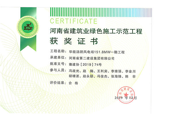 华能汤阴风电场151.8MW一期工程荣获河南省建筑业绿色施工示范工程