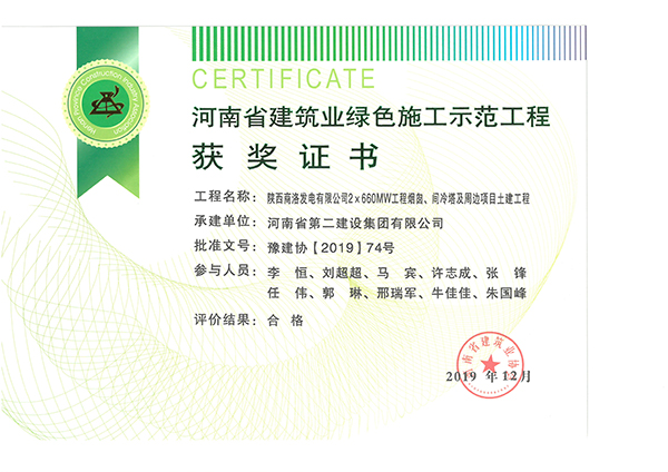 陕西商洛发电有限公司2×660MW工程烟囱、间冷塔及周边项目土建工程荣获河南省建筑业绿色施工示范工程