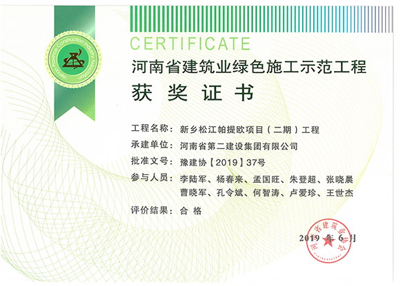 新乡松江帕提欧项目(二期)工程荣获河南省建筑业绿色施工示范工程