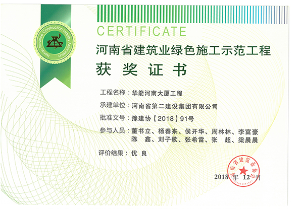 华能河南大厦工程荣获河南省建筑业绿色施工示范工程