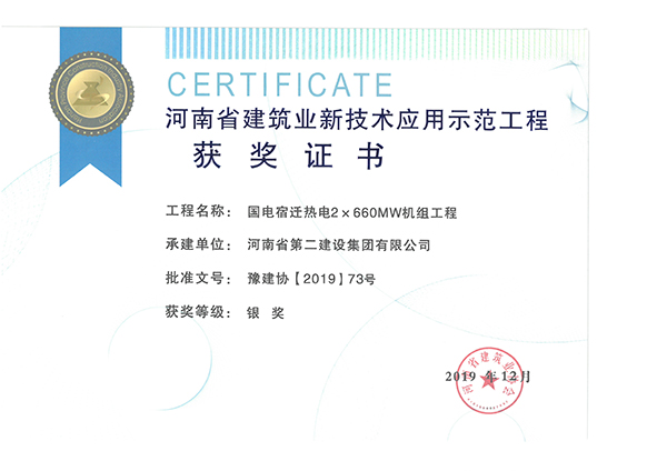 国电宿迁热电2×660MW机组工程荣获河南省建筑业新技术应用示范工程银奖