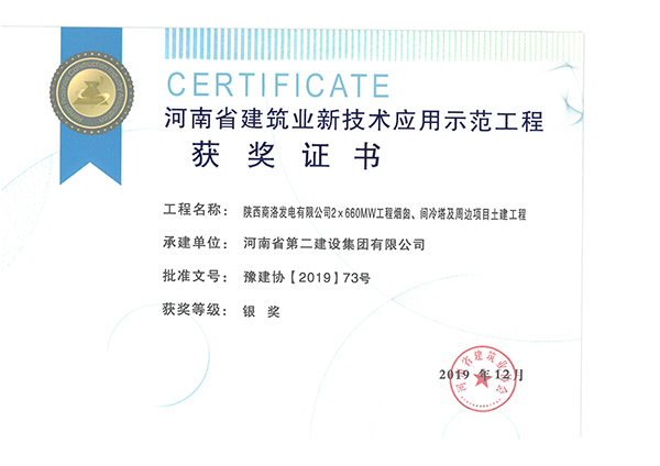 陕西商洛发电有限公司2×660MW工程烟囱、间冷塔及周边项目土建工程荣获河南省建筑业新技术应用示范工程银奖