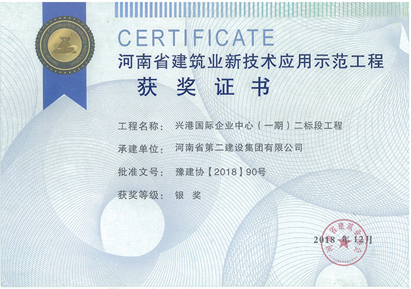 兴港国际企业中心项目荣获河南省建筑业新技术应用示范工程银奖
