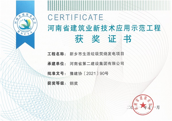 新乡市生活垃圾焚烧发电项目荣获河南省建筑业新技术应用示范工程铜奖