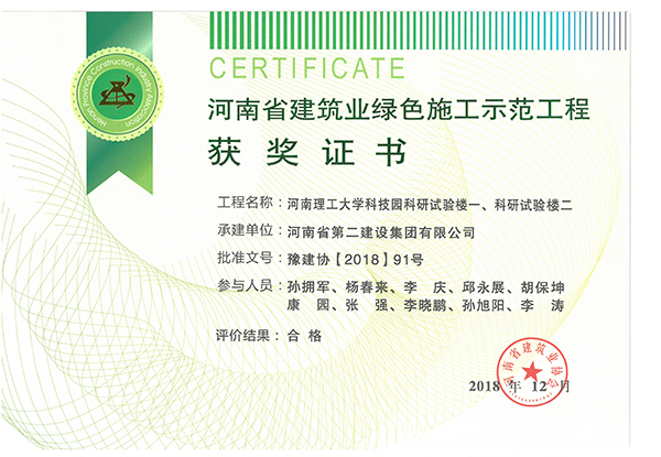 河南理工大学科技园科研试验楼一、科研试验楼二荣获河南省建筑业绿色施工示范工程