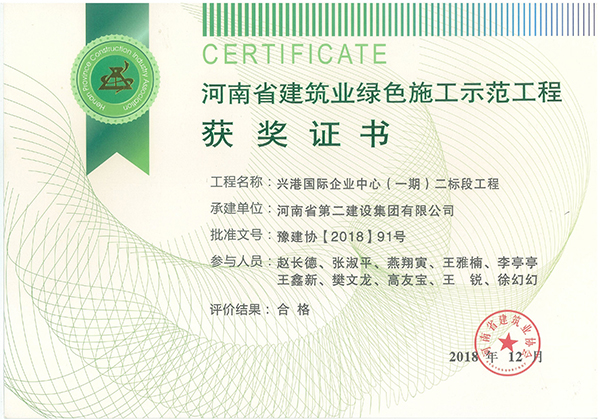 兴港国际企业中心(一期)二标段工程荣获河南省建筑业绿色施工示范工程