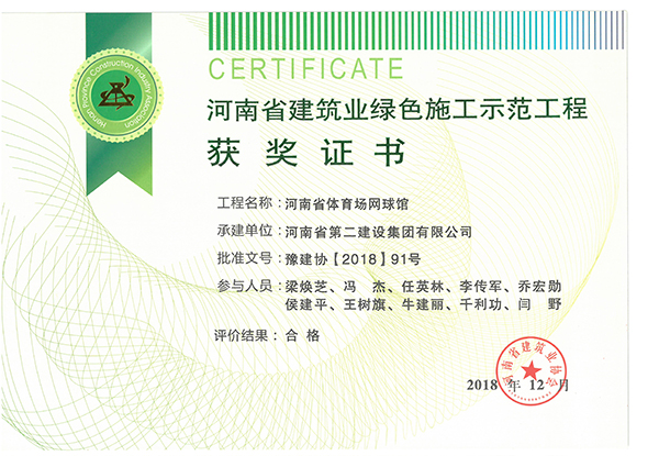 河南省体育场网球馆荣获河南省建筑业绿色施工示范工程