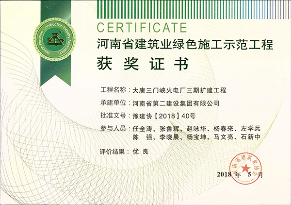 大唐三门峡电厂三期扩建工程荣获河南省建筑业绿色施工示范工程