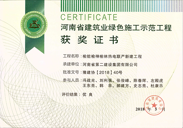 榆能榆神榆林热电联产扩建工程荣获河南省建筑业绿色施工示范工程