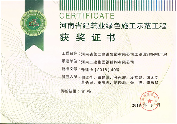 河南省第二建设集团有限公司工业园3#钢构厂房荣获河南省建筑业绿色施工示范工程