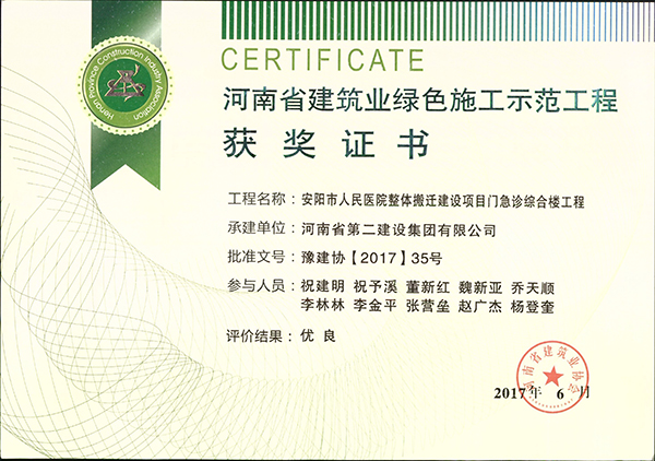 安阳市人民医院整体搬迁建设项目门急诊综合楼工程荣获河南省建筑业绿色施工示范工程