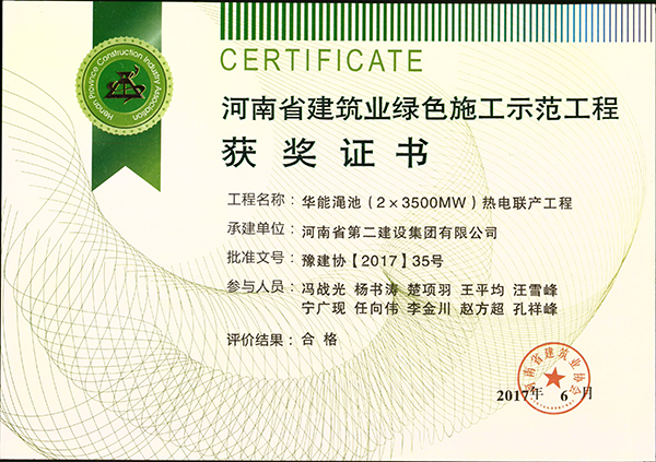 华能渑池(2×350MW)热电联产工程荣获河南省建筑业绿色施工示范工程