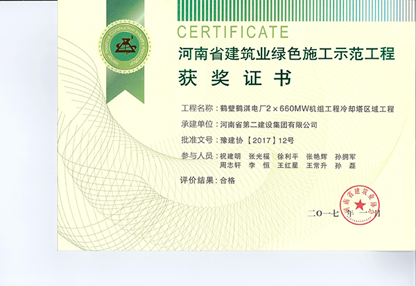 鹤壁鹤淇电厂2×660MW机组工程冷却塔区域工程荣获河南省建筑业绿色施工示范工程