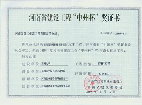 继第八届中国国际工程项目管理高峰论坛暨全国建筑业企业优秀项目经理表彰大会落下帷幕,我公司获多项殊荣之后再传喜报。我公司参评 2009 年度河南省建设工程“中州杯”奖的项目经过专家现场复查、评审和公示之后,日前,由河南省住房和城乡建设厅下发的豫建建 [2009]102 号文“关于 2009 年度河南省建设工程‘中州杯'奖(省优质工程)获奖单位的通报”及河南省建筑业协会豫建协 [2009]40 号文“关于颁发 2009 年度河南省建设工程‘中州杯'奖(省优质工程)的决定”文件中,我公司施工的两项工程榜上有名。分别是:第一分公司施工的鹤壁煤电综合科技楼工程、郑州分公司施工的郑州大学新校区教师公寓三组团一标段( 1# 、 2# 、 3# 、 4# 楼)工程。