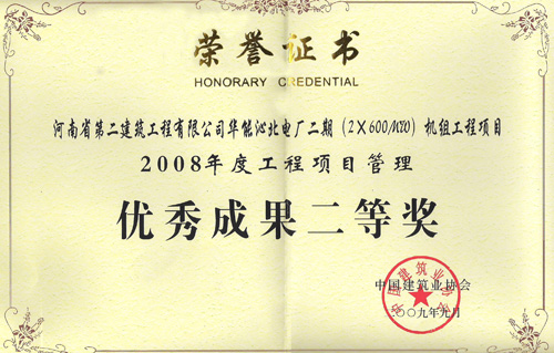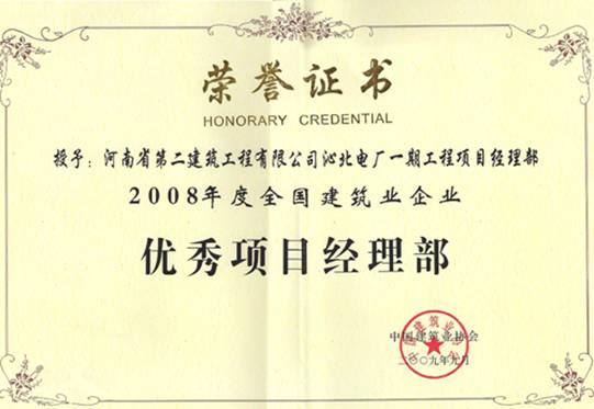 2009 年 9 月 8 日 ,第八届中国国际工程项目管理高峰论坛暨全国建筑业企业优秀项目经理表彰大会在济南开幕。此次会议表彰了 2008 年度全国建筑业企业优秀项目经理 600 名、全国建筑业企业优秀项目经理部 82 个和全国建设工程优秀项目管理成果单位 97 个。我公司在参评企业多、竞争激烈的情况下,依然保持良好势头,取得了较好的成绩,为公司赢得了荣誉。获奖项目及荣誉为:大唐电力工程部三门峡电厂二期( 2 × 600MW )机组工程项目荣获“ 2008 年度全国建设工程优秀项目管理成果”一等奖;华能电力工程部沁北电厂二期( 2 × 600MW )机组工程项目荣获“全国建设工程优秀项目管理成果”二等奖。同时,沁北电厂一期工程项目经理部被评为“全国建筑业企业优秀项目经理部”;公司总工程师助理陈建中同志荣获“ 2008 年度全国建筑业企业优秀项目经理”殊荣。
